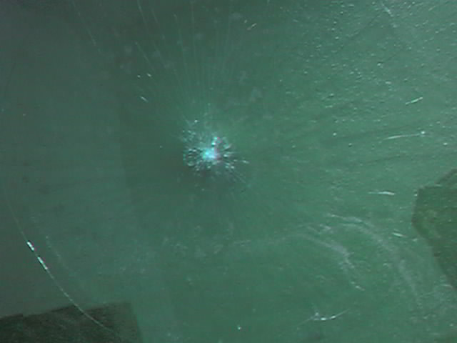 szyba z folią klasy P2 po kilkunastu uderzeniach ostrym narzędziem